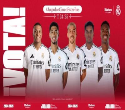 体育资讯2月4日报道宣称 官方公布了皇马1月最佳球员候选:姆巴佩、贝林厄姆、巴尔韦德、罗德里戈、维尼修斯。