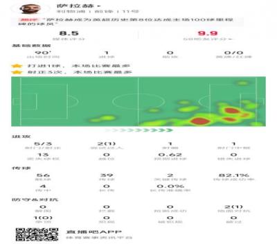 萨拉赫本场数据:射门5次射正3次打进1球,2次关键传球&获评8.5分