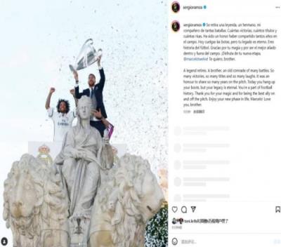 拉莫斯:“一位传奇退役了,你是我的一个兄弟,一位多年并肩战斗的老战友。我们一起赢得过那么多的胜利,那么多的冠军,那么多的欢乐,能在球场上和你共事这么多年是我的荣幸。