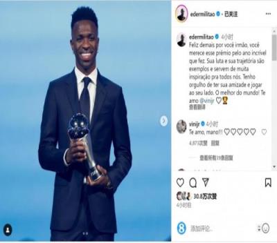 体育资讯12月18日报道宣称 维尼修斯当选FIFA年度最佳球员,他在皇马和巴西国家队的队友米利唐社媒发文,对维尼修斯表示祝贺。