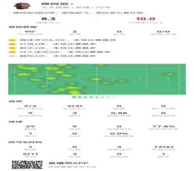 穆阿尼本场2射进2球4过人3成功+3越位3抢断8.3分全场最高