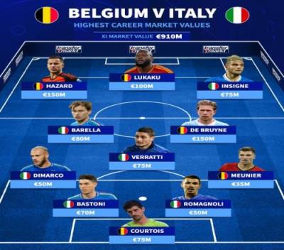 体育资讯11月14日报道宣称 北京时间明天凌晨,比利时将在欧国联比赛中主场对阵意大利,德国转会市场列出了两队历史最贵阵容,德布劳内、阿扎尔、因西涅、巴雷拉在列,总价9.1亿欧元。