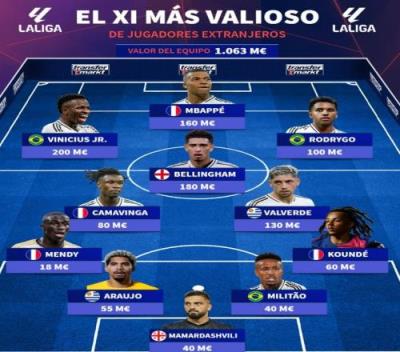 体育资讯1月21日报道宣称 德转盘点了目前西甲身价最高的外籍球员阵容,其中姆巴佩、贝林厄姆等9名皇马球员在列,以下为具体阵容: