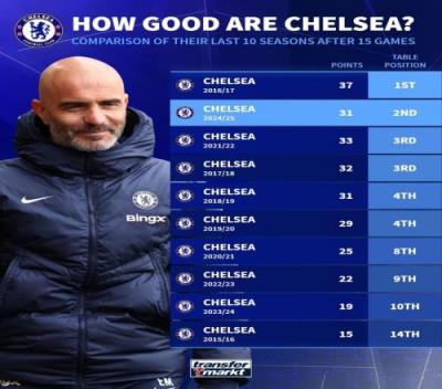 切尔西英超前15轮排名第2位,近10个赛季同期排名第二高