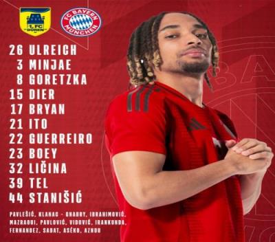拜仁对阵迪伦首发:26-乌尔赖希、3-金玟哉、15-戴尔、21-伊藤洋辉、44-斯坦尼西奇、23-博伊、8-格雷茨卡、22-格雷罗、32-利西纳、17-萨拉戈萨、39-特尔