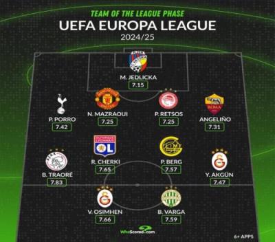 后卫:波罗(热刺,7.42分)、马兹拉维(曼联,7.25分)、雷索斯(奥林匹亚科斯,7.25分)、安吉利诺(罗马,7.31分)