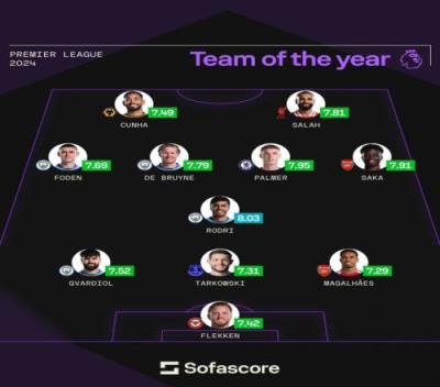 体育资讯1月1日报道宣称 2025年已至,sofascore也统计了2024年英超年度评分最佳阵容,曼城4将在列。