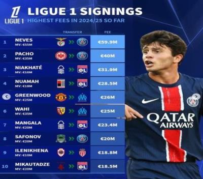 德转更新法甲引援榜:若昂内维斯领衔巴黎3将,青木、瓦希上榜