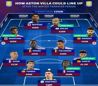 体育资讯2月5日报道宣称 阿斯顿维拉在今年冬窗引进了多位球员,《转会市场》也据此预测了一套补强后的首发阵容。