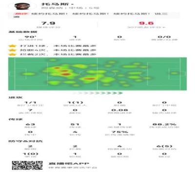 体育资讯2月3日报道宣称 阿森纳在本轮英超5-1大胜曼城,托马斯本场数据如下:
