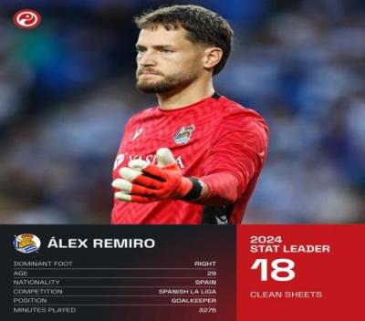 体育资讯12月28日报道宣称 squawka统计了西甲门将2024年度零封榜,皇社门将雷米罗以18场居首。