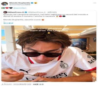 在巴黎奥运会上,杜普兰蒂斯以6米25的成绩打破自己保持的男子撑杆跳世界纪录,赢得金牌,赛后他在社交媒体上发布身穿AC米兰球衣吃饭的视频。