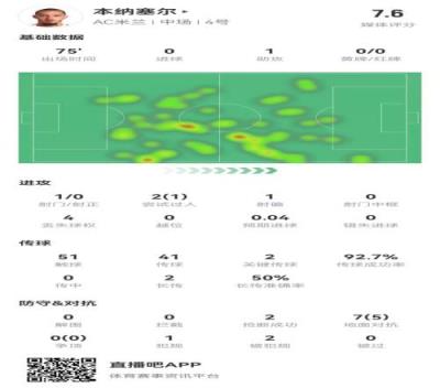 体育资讯1月23日报道宣称 米兰在本轮欧冠1-0领先赫罗纳,本纳塞尔本场数据如下: