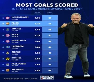 执教球队前16场进球榜:纳帅拜仁65球居首,弗里克巴萨55球次席