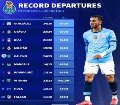 体育资讯2月4日报道宣称 曼城已经官宣签下波尔图中场尼科-冈萨雷斯,《转会市场》也统计了波尔图队史卖人最贵榜。