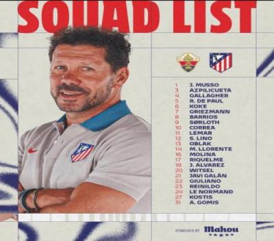 马竞公布对阵埃尔切大名单:格列兹曼领衔,阿尔瓦雷斯在列