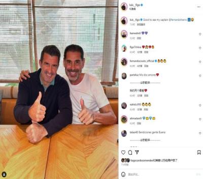 体育资讯11月8日报道宣称 皇马名宿菲戈在社交媒体上晒出了自己和老队友耶罗的合影,并写道:“很高兴见到我的队长,@耶罗。”