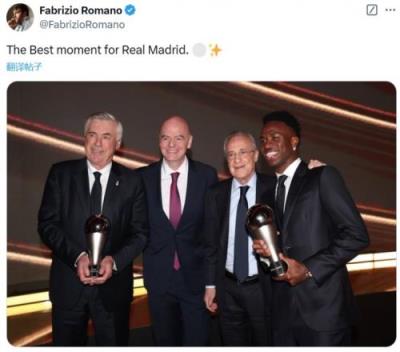 名记罗马诺也晒出了皇马主席弗洛伦蒂诺携主帅安切洛蒂、巴西边锋维尼修斯与FIFA主席因凡蒂诺的合照,并配文:“皇马的最佳时刻”。