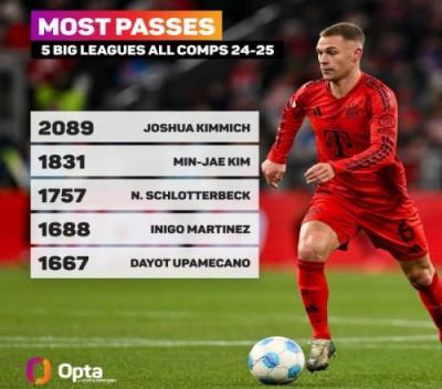 体育资讯12月3日报道宣称 据Opta统计,基米希本赛季各赛事传球2089次,五大联赛球员中最多,传球成功率高达93.1%。