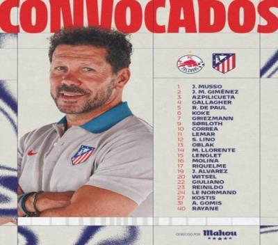 马竞公布战萨尔茨堡大名单:阿尔瓦雷斯领衔锋线,勒诺尔芒在列