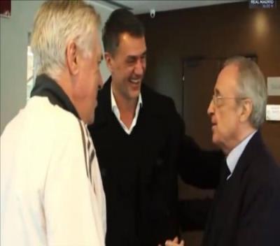 在皇马官方发布的一段视频中,俱乐部主席弗洛伦蒂诺、球队主帅安切洛蒂与马尔蒂尼互动寒暄。安切洛蒂与马尔蒂尼曾在米兰做过队友,两人同时还是师徒关系。