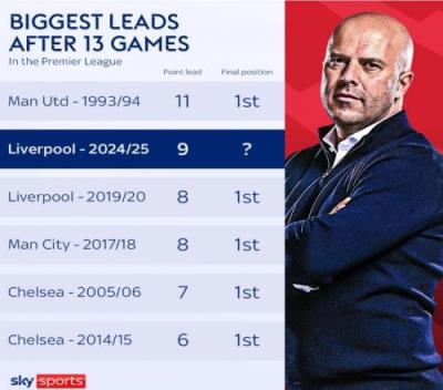 英超13轮后最大领先分数:9394曼联11分居首,本赛季利物浦次之