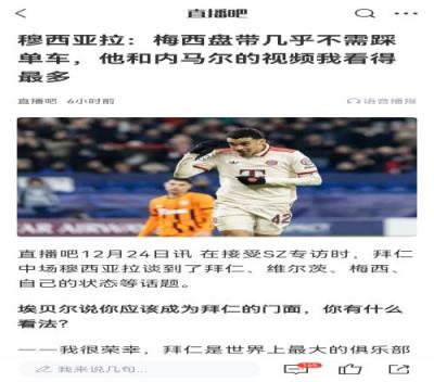 体育资讯12月24日报道宣称 穆西亚拉在采访中谈到自己学习盘带看的最多的两位球员,分别是内马尔和梅西。这位拜仁球星还提到,“梅西的盘带更自然,他几乎不需要踩单车”。