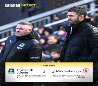 鲁尼执教的普利茅斯33战平卡里克执教的米堡,仍然排名英冠垫底