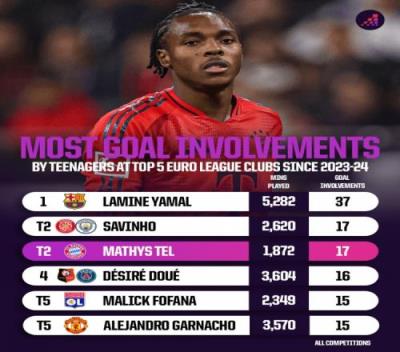 特尔近2赛季直接参与17球和萨维尼奥并列,五大联赛U20仅次亚马尔