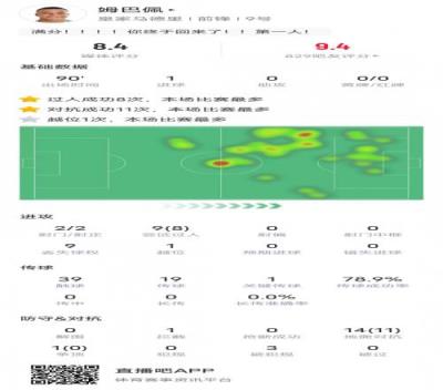 姆巴佩本场数据:1进球1关键传球&8次过人成功全场最多,评分8.4