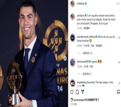 C罗更新社媒庆祝得奖:“能因我在国家队的职业生涯而获得这个奖项,我感到无比自豪。未来还有很多目标等待我去征服!感谢葡萄牙!”
