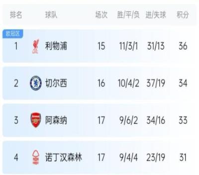 英超榜首:利物浦;卫冕冠军:曼城