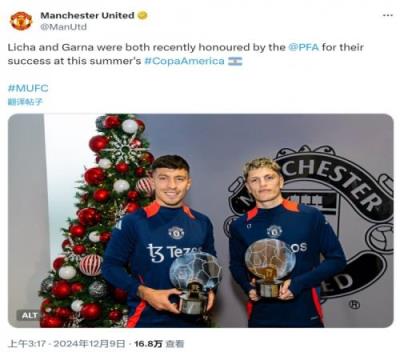利桑德罗、加纳乔今夏随阿根廷队赢得美洲杯冠军,PFA向他们颁发荣誉奖杯,曼联官方社媒晒出两人领取奖杯的照片,对他们表示祝贺。