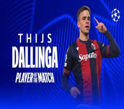 体育资讯1月22日报道宣称 欧冠联赛阶段第7轮,博洛尼亚主场2-1战胜多特蒙德,达林加当选全场最佳球员。