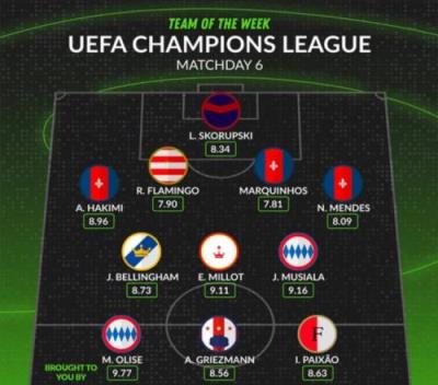 体育资讯12月12日报道宣称 本轮欧冠战罢,数据网站Whoscored也评选出本轮比赛评分最高阵容,其中贝林厄姆、穆西亚拉等在列,以下为具体阵容: