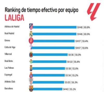 数据统计显示,马竞在本赛季的西甲场均净比赛时间59分48秒、皇马则是59分46秒,分列联赛前二。赫罗纳和塞尔塔以59分07秒并列第三。