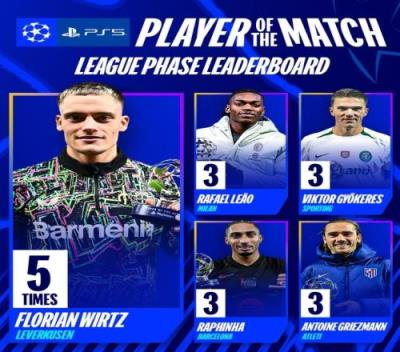 体育资讯1月31日报道宣称 欧冠联赛阶段8轮全部战罢,欧冠官方也盘点了在本赛季获评全场最佳球员最多次数榜,其中维尔茨5次当选最多。具体如下: