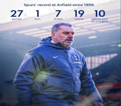 根据天空体育的数据统计,1999年以来,热刺27次做客安菲尔德仅仅赢下1场比赛,输掉了其中的19场,有10场比赛都是比主队少打进1球。
