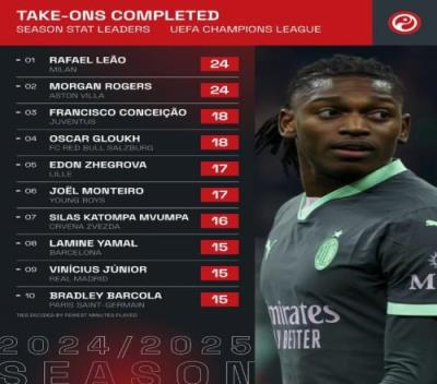 本赛季欧冠成功过人榜:莱奥、罗杰斯24次居首,小孔塞桑18次