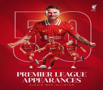 英超第19轮,利物浦客场挑战西汉姆,阿根廷中场麦卡利斯特首发出战,这也是他代表利物浦出战的第50场英超,他此前49场比赛贡献6球7助攻。