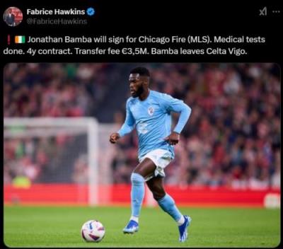 记者:塞尔塔前锋班巴与芝加哥火焰签约,转会费350万欧