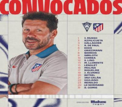 体育资讯1月4日报道宣称 北京时间5日凌晨4:30,国王杯第3轮马贝拉vs马竞,马竞公布此役大名单。