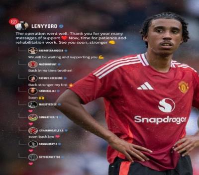 约罗在今夏加盟曼联后在友谊赛中跖骨受伤,现在他已经接受了手术,根据此前报道,球员预计缺阵3个月时间。术后,约罗在社交媒体发文报平安,而曼联也选了一些球员们的祝福评论,晒在了官推上。