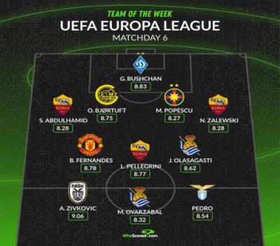 体育资讯12月13日报道宣称 欧联杯第6轮比赛战罢,WhoScored列出了本周欧联杯最佳阵容,B费、佩德罗在列,罗马3名球员入选。