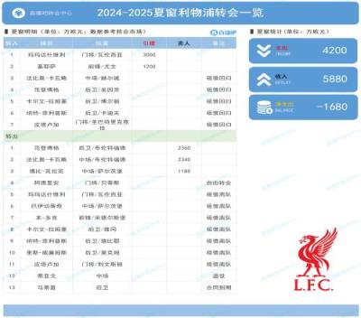 太抠了!利物浦夏窗净支出1680万,其他5大联赛领头羊投入均破亿