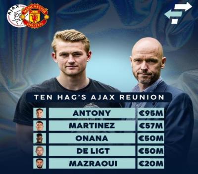 算上此前签下的安东尼、利马以及奥纳纳,曼联新赛季阵中将拥有5名滕哈赫的贾府旧部。这五人总共花费了曼联超2.7亿欧的转会费。↓