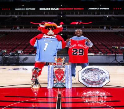 芝加哥公牛官方社媒晒出赖特-菲利普斯与吉祥物的合照,他们身前摆着曼城上赛季获得的冠军奖杯。