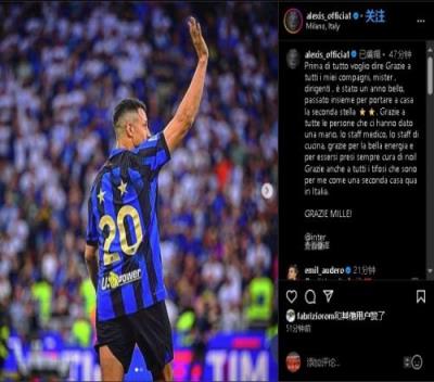 告别蓝黑!35岁前锋桑切斯发文告别国米:谢谢大家带来的美好回忆