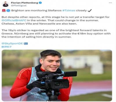 记者:布莱顿关注19岁希腊前锋齐马斯,切尔西、维拉、纽卡也有意