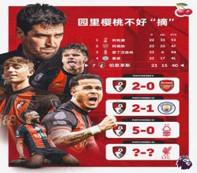 此前伯恩茅斯主场5-0大胜诺丁汉森林、主场2-0击败阿森纳、主场2-1击败曼城。